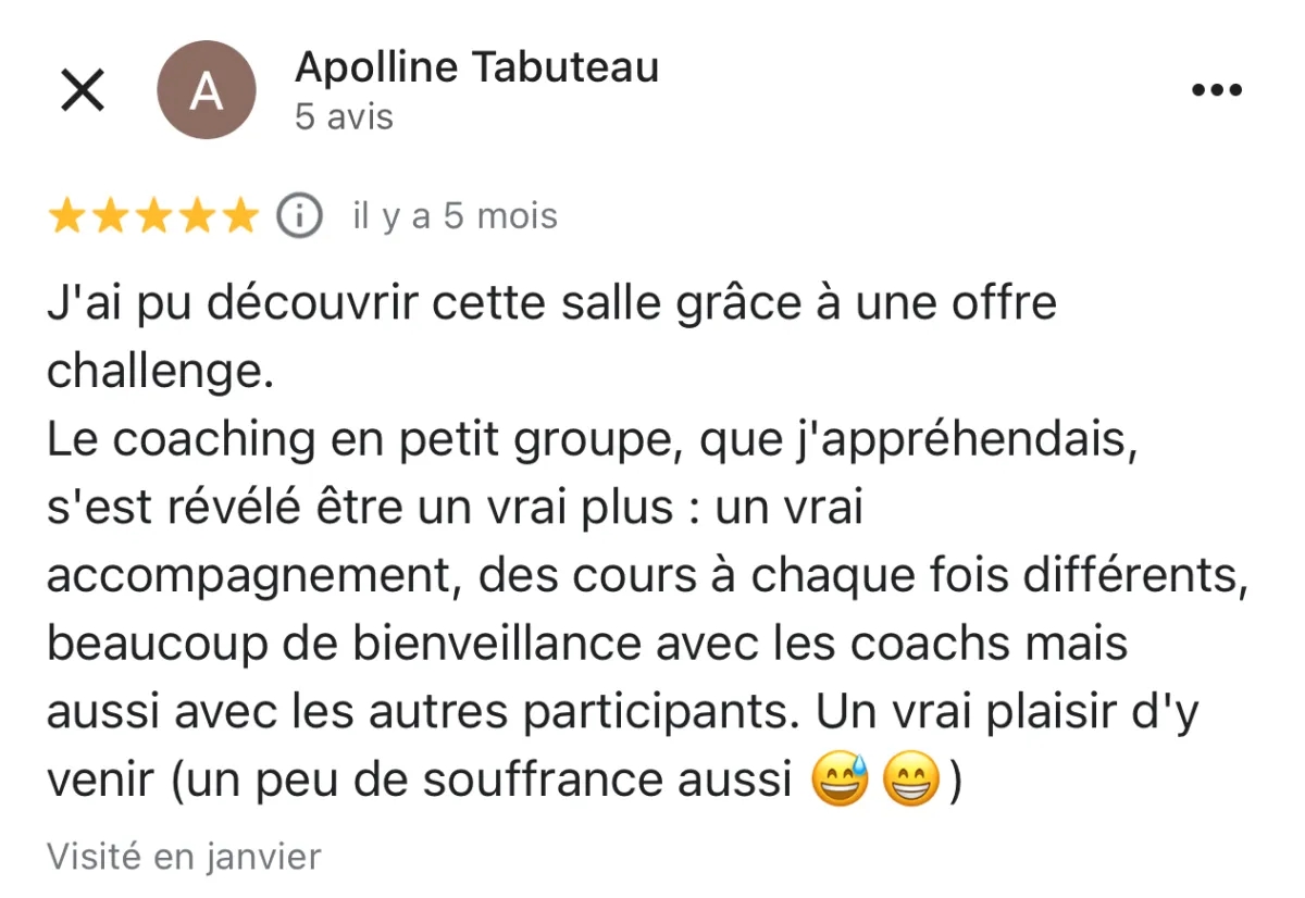 Chaque séance combine des exercices adaptés à chaque participant avec une dynamique de groupe motivante. Vous ne serez pas plus de 8 par cours. Votre coach s’assure que chacun progresse à son rythme.